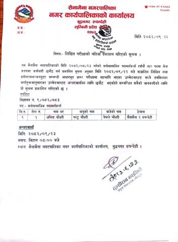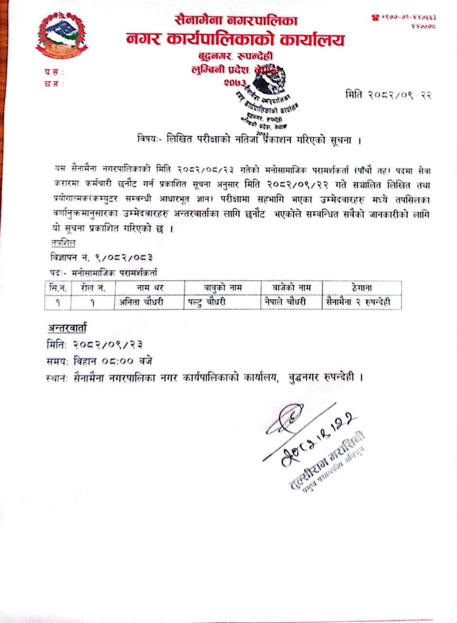 लिखित परीक्षाकाे नतिजा प्रकाशन गरिएकाे सूचना ।