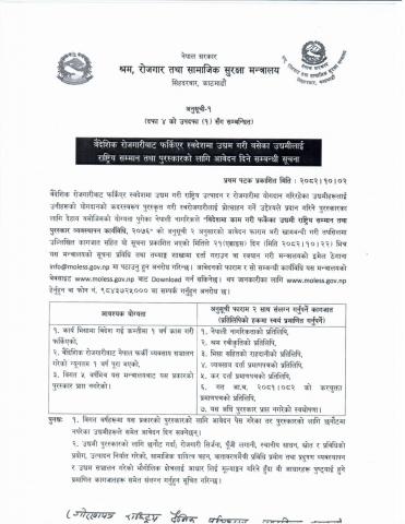 वैदेशिक राेजगारीबाट फर्किएर स्वदेशमा उद्यम गरी बसेका उद्यमीलाइ राष्ट्रिय सम्मान तथा पुरस्कारकाे लागि अावेदन दिने सम्बन्धी सूचना ।